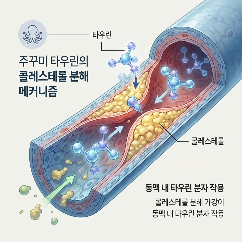 주꾸미에 풍부한 타우린 은 단순히 피로 해소에만 좋은 것이 아닙니다. 간에서 콜레스테롤을 담즙산으로 바꿔 배출하게 하는 ACAT 효소 활성을 억제합니다. 즉, 삼겹살의 포화지방이 혈관에 쌓이기 전, 주꾸미의 타우린이 '천연 유화제' 역할을 하여 콜레스테롤 흡수를 직접 차단하는 원리입니다.